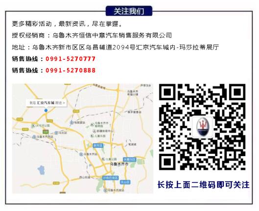 乌鲁木齐恒信中意Maserati&AlfaRomeo中心依托恒信汽车集团多年汽车销售服务经验,坚持“从客户的利益出发,不断满足客户需求”的经营理念,竭诚为新疆广大尊贵的玛莎拉蒂及阿尔法罗密欧品牌的车主提供实至名归的品牌特有的汽车销售(Sales)、维修保养(Service)、零部件供应(Spare part)服务体验。