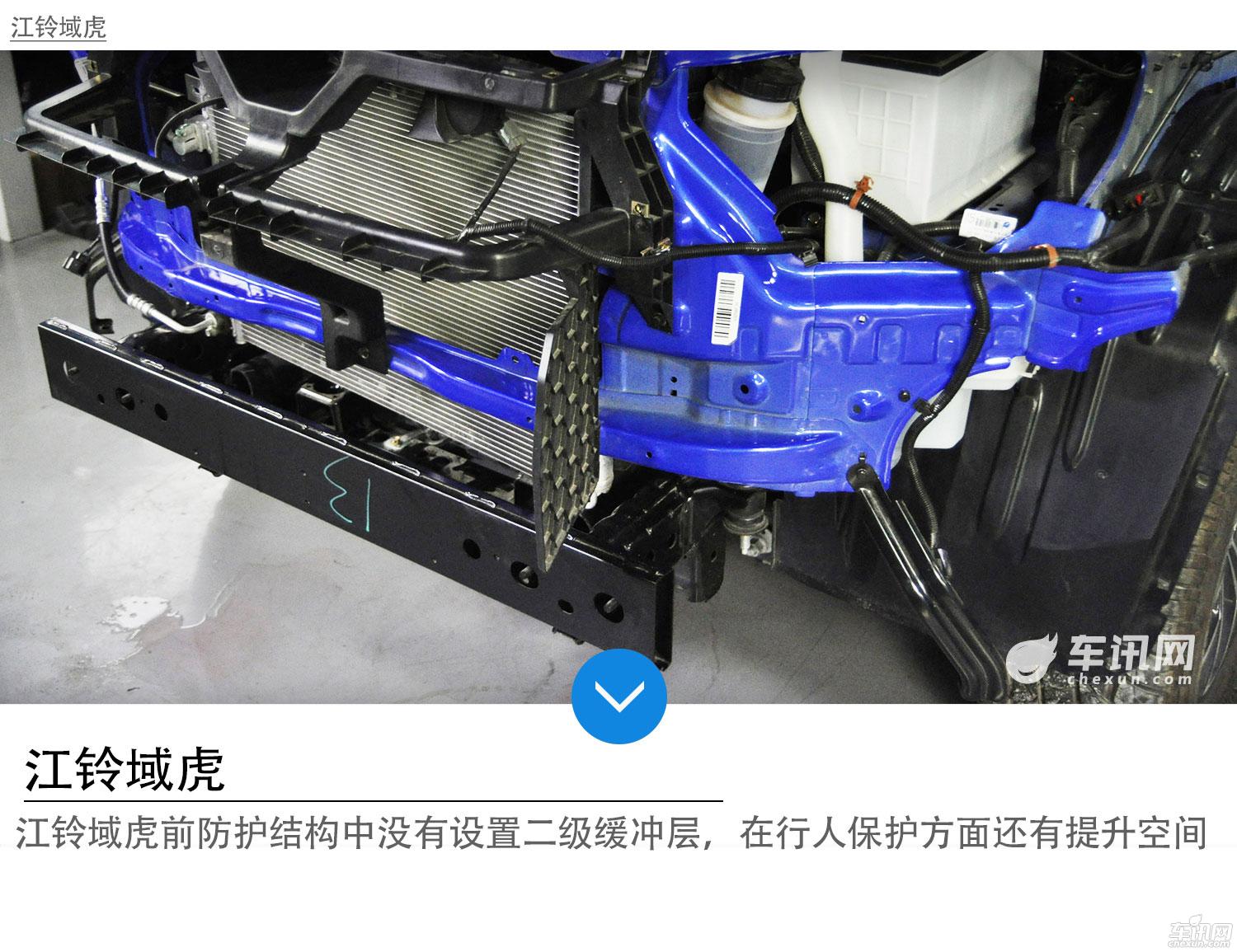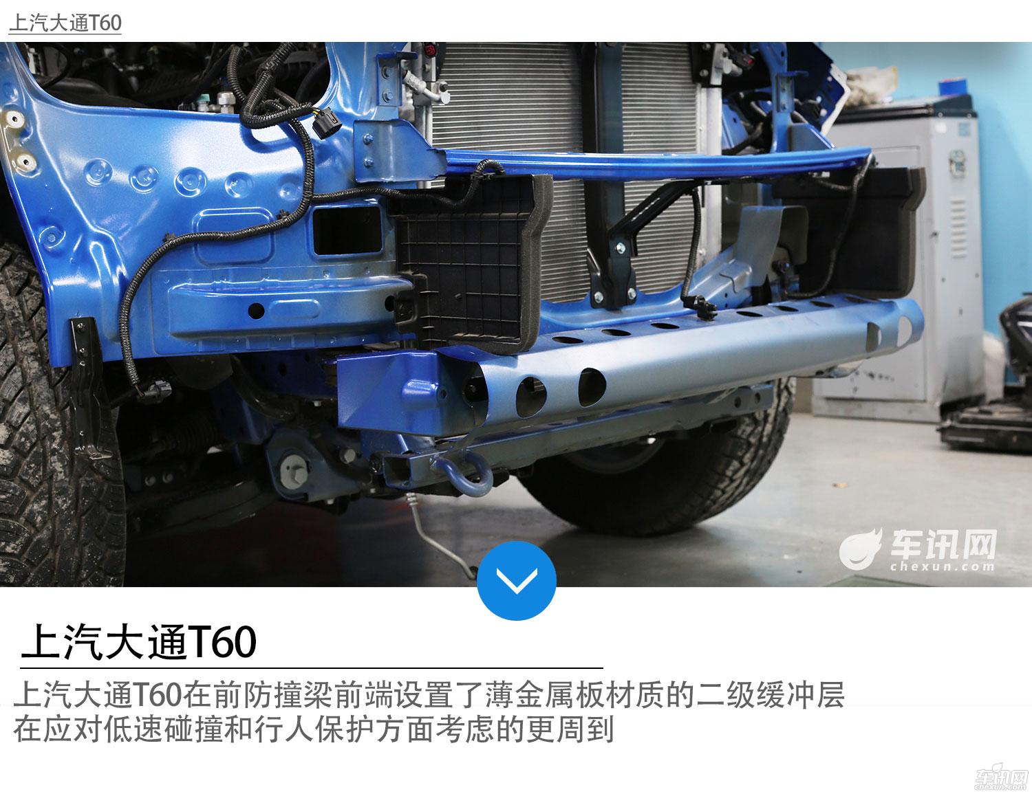 两款车不同的是,上汽大通T60在前防撞梁前端还设置了薄金属板材质的二级缓冲层,在应对低速碰撞和行人保护方面,江铃域虎仍有较大提升空间。