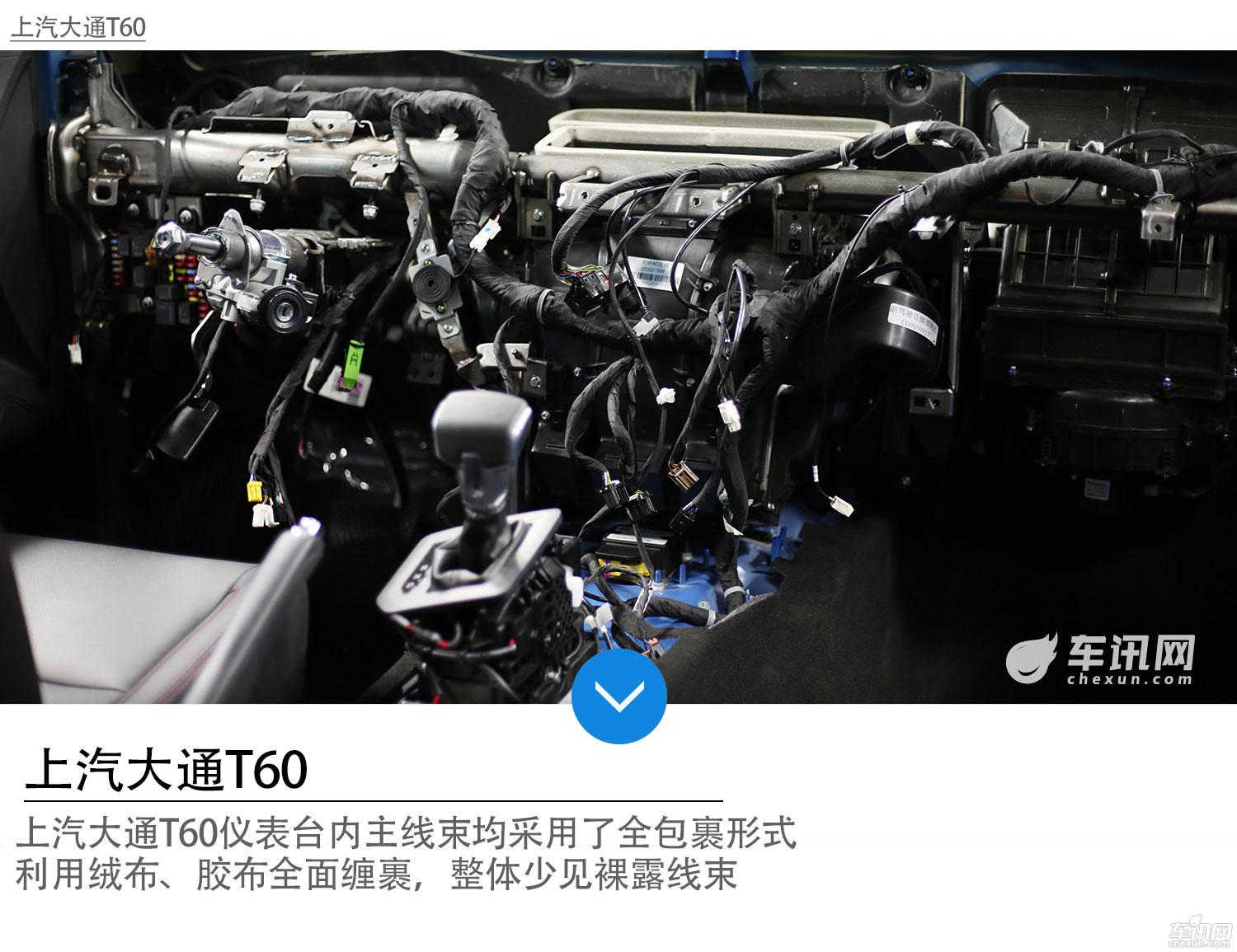 线路安全也是汽车防护结构的重要组成部分之一,我们以两款车线束最为集中的仪表台内为例,上汽大通T60仪表台内主线束均采用了全包裹形式,利用绒布、胶布全面缠裹,整体少见裸露线束。