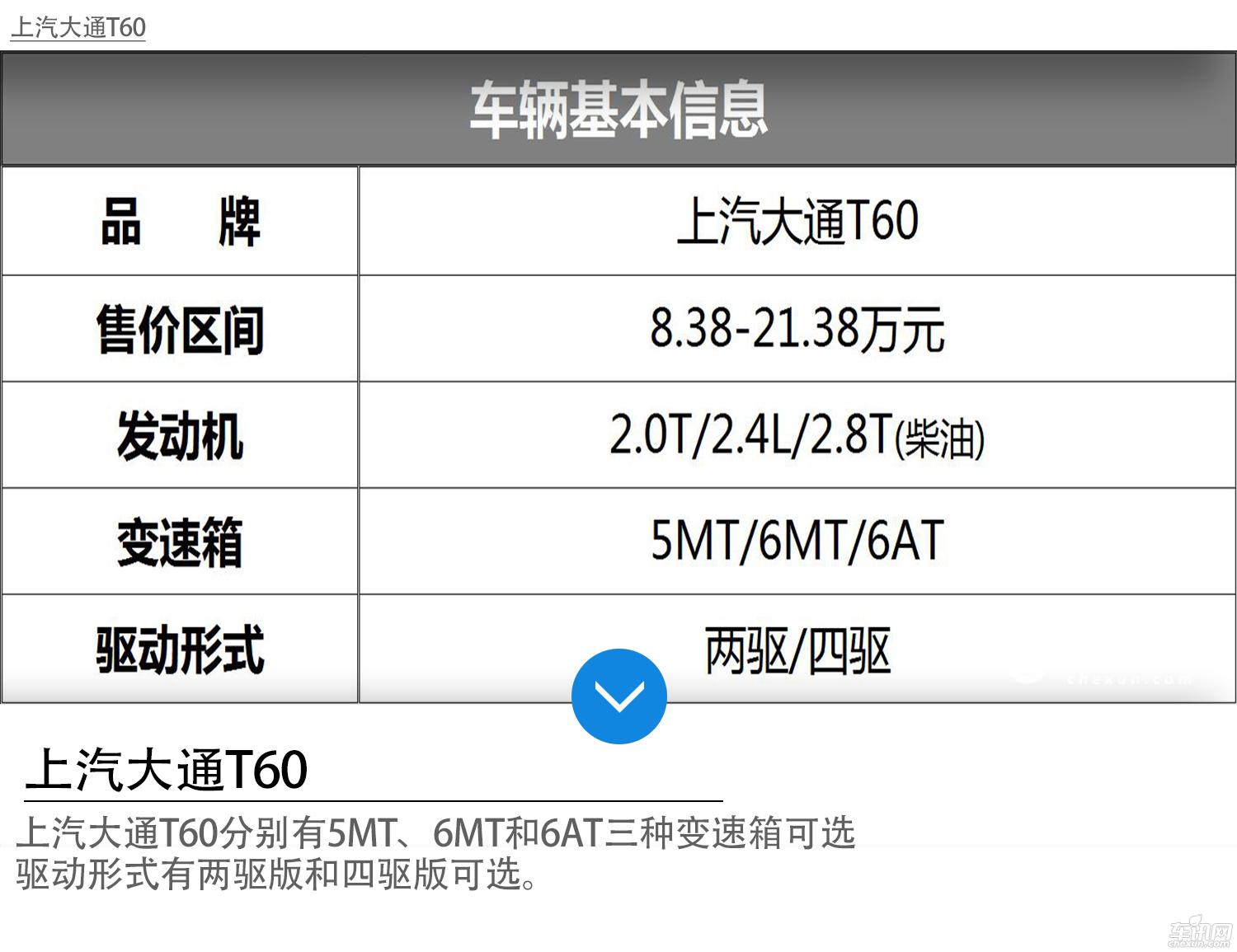 根据不同的动力配置,上汽大通T60分别有5MT、6MT和6AT三种变速箱可选,驱动形式有两驱版和四驱版可选。