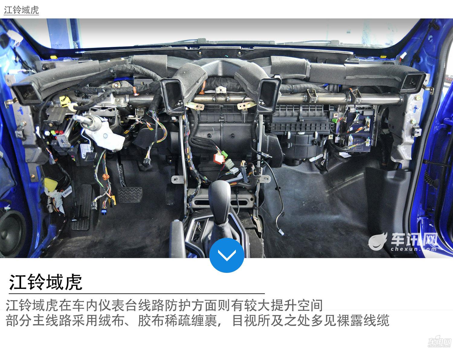 江铃域虎在车内仪表台线路防护方面则有较大提升空间,部分主线路采用绒布、胶布稀疏缠裹,目视所及之处多见裸露线缆。