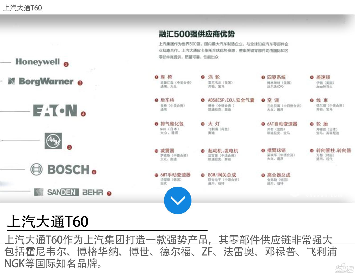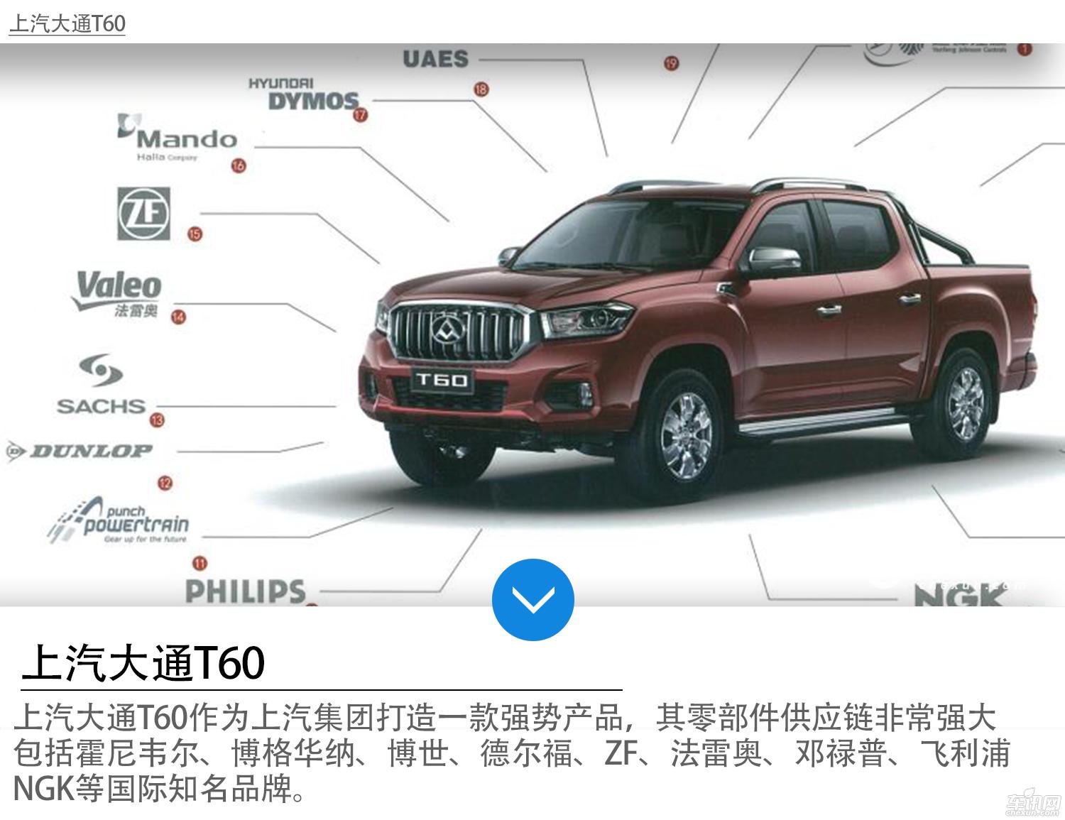 值得一提的是,上汽大通T60作为上汽集团打造一款强势产品,其零部件供应链非常强大,包括霍尼韦尔、博格华纳、博世、德尔福、ZF、法雷奥、邓禄普、飞利浦、NGK等国际知名品牌,全球500强企业。