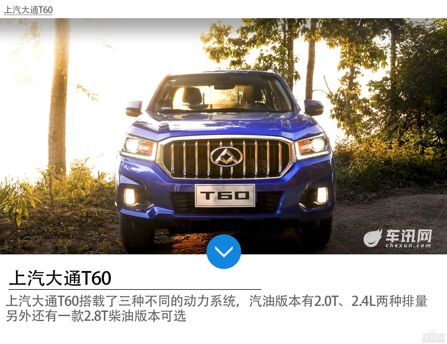 2016年广州车展,上汽大通T60正式发布,售价区间为8.38-21.38万元,目前市面销售的上汽大通T60搭载了三种不同的动力系统,分别是2.0T汽油版本、2.4L汽油版本及2.8T柴油版本。