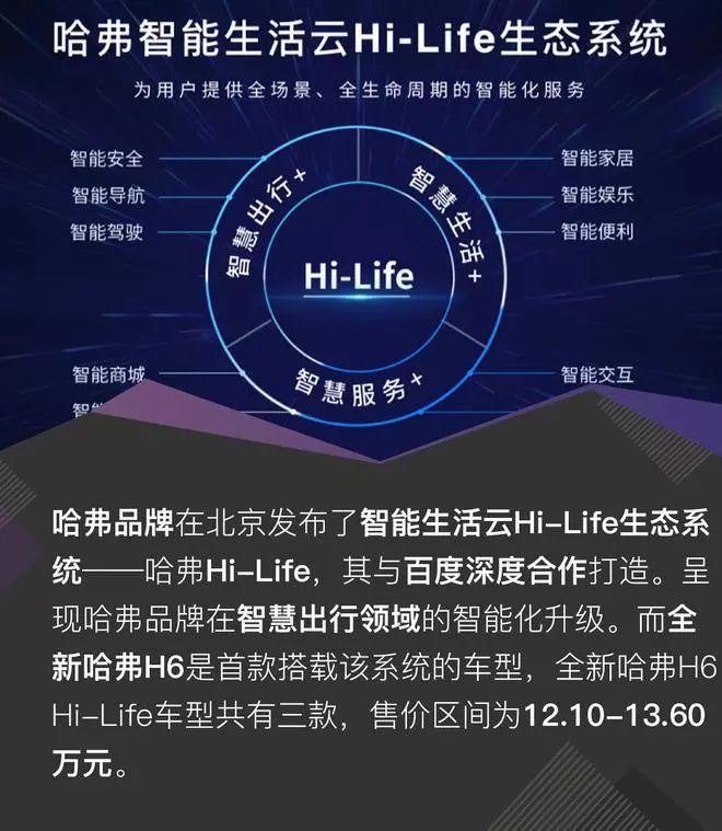 哈弗市场营销总监张福志在介绍Hi-Life生态系统时表示,‘智慧出行’、‘智慧生活’、‘智慧服务’是这套车载互联系统最核心的三个部分,可以帮助车主实现7×24小时不间断的服务,同时这款系统也率先搭载在全新哈弗H6之上。
