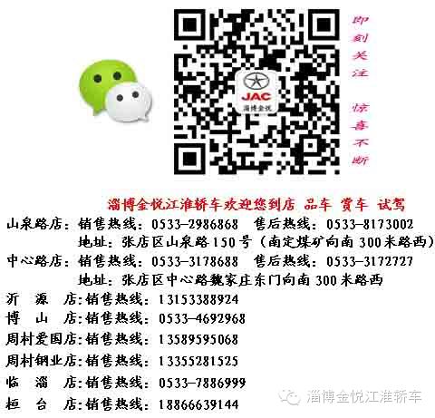 每天我们都会将有关江淮轿车的最新资讯,店内的最新活动动态,最新优惠政策,在微信平台发布,关注淄博金悦江淮轿车官方微信并推荐给您身边的朋友吧,淄博金悦-江淮伴你身边!