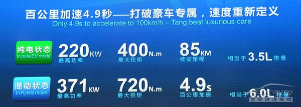 “唐”双模混动SUV,搭载比亚迪的DMⅡ代混动系统,双模电动车驱动系统大幅度的提高了电机的功率和转速,系统最大输出功率220KW,最大扭矩400Nm,百公里加速时间仅4.9秒。相比DMⅠ代混动技术,比亚迪的DMⅡ代混动系统主要通过换装更加高效强劲的TID总成、高转速电机、集成式电机控制器、更安全的铁电池等实现了更强的动力性能和更优的经济性能。