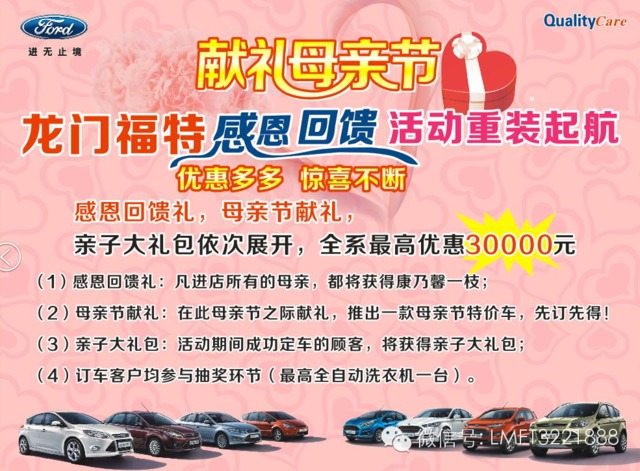 这个母亲节,龙门福特旗舰店给你一个不一样的体验,从贴心小细节为“妈妈”的喜悦加油,为“妈妈”的健康加分!