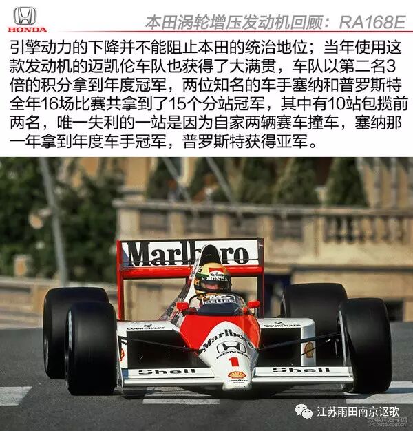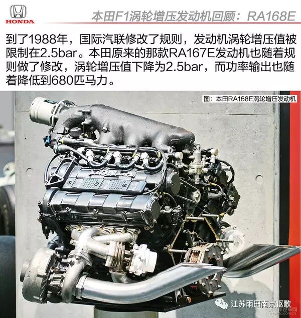 面对着本田涡轮增压发动机一家独大的场面,为了不让接下来的比赛变得毫无悬念而失去观赏性,国际汽联开始坐不住了。1988年针对涡轮增压发动机增压值的限制规则出台,新规则将发动机的涡轮增压值限制在2.5bar以内。这一年跟随规则的变化,本田推出了新的RA168E发动机。根据规则的限制,新的RA168E涡轮引擎增压值从原来的4bar下降到2.5bar,功率输出也从原来的1050马力大幅下降到680。