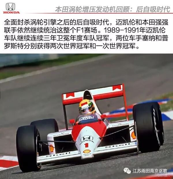 1988迈凯伦车队取得巅峰性胜利之后,面对本田涡轮增压引擎这种毁灭性的统治势头,国际汽联彻底坐不住了。1989年全面封杀涡轮增压引擎的规则出台,新规则规定参赛赛车只能使用自然吸气引擎,彻底封杀涡轮增压引擎。然而,属于本田的时代依然没有结束。1989继续推出一款3.5L V10自然吸气发动机,在接下来的三年里,继续使用本田自然吸气引擎的迈凯伦车队连续三年卫冕年度车队冠军,两位车手塞纳和普罗斯特在三年期间也分别获得两次世界冠军和一次世界冠军。