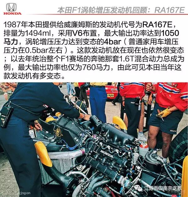 1987年是本田涡轮增压发动机在F1赛场上实现统治地位的一年,这一年本田发布了那款令欧洲车厂们汗颜的1.5T发动机RA167E,最大输出功率达到了惊人的1050匹马力;当年使用该款发动机的威廉姆斯车队继续卫冕年度车队冠军,两位车手包揽冠亚军。1050马力的最大输出功率放在今天来看依然非常变态(上一赛季冠军车队奔驰那套1.6T混合动力系统综合输出功率也仅为760马力),增压器4bar的增压值(普通家用车在0.5bar左右)实在让人难以想象。