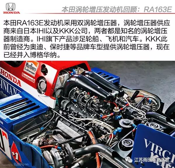根据维基百科的资料,本田RA163E发动机使用的的涡轮来自两个品牌,分别是日本的IHI(IHI株式会社)以及此前的KKK涡轮。两个公司都是知名的涡轮增压器品牌,IHI涉足的领域包括船用涡轮、飞机涡轮;而KKK此前曾为奥迪和保时捷等旗下车型提供涡轮增压器,不过现在KKK已经并入博格华纳。